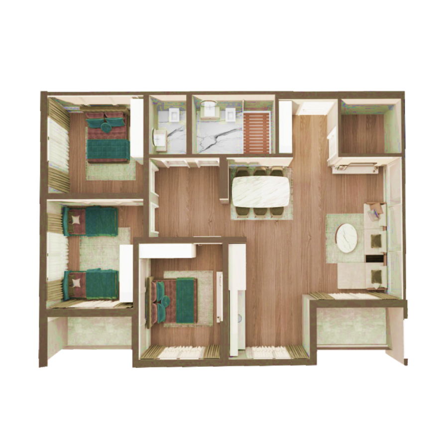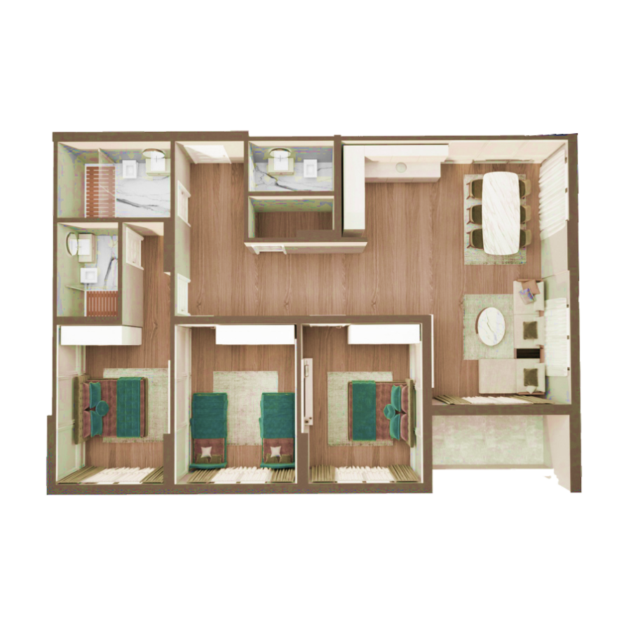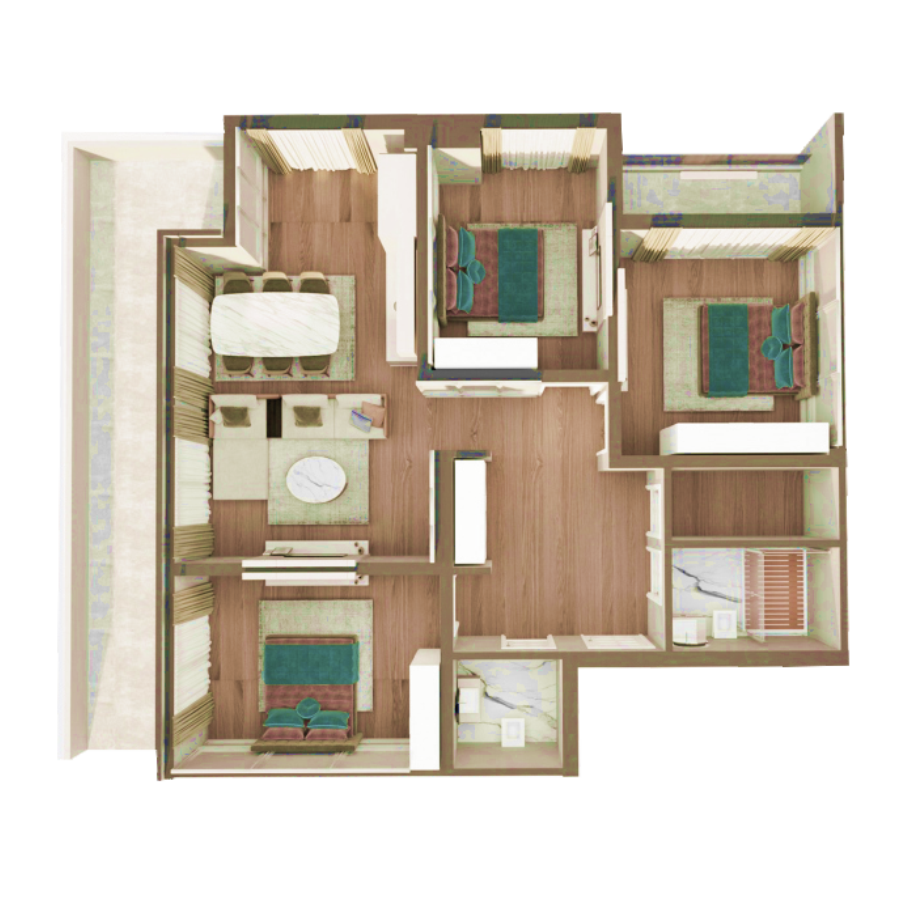 3 Dhoma Gjumi • 1 Dhomë e ndejës • 2 Tualet (WC) • 1 Kuzhinë • 1 Depo • 2 Terasë • 1 Penthouse
